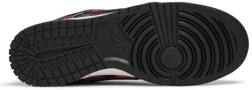 The Nike Dunk Low Graffiti Pink features mismatched right and left shoes, each with a canvas upper with a perforated toebox and a mottled pattern of pink, purple, green, black, and red.