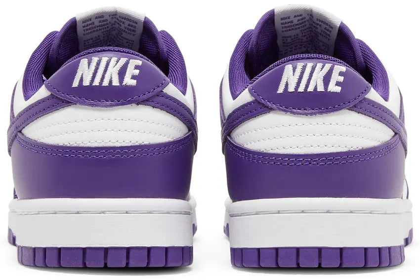 The Nike Dunk Low Championship Purple features a white leather upper with Championship Purple overlays and Swooshes. Nike embroidery at the heel pays tribute to the original 1985 design. At the base, a white and purple sole adds the finishing touch.